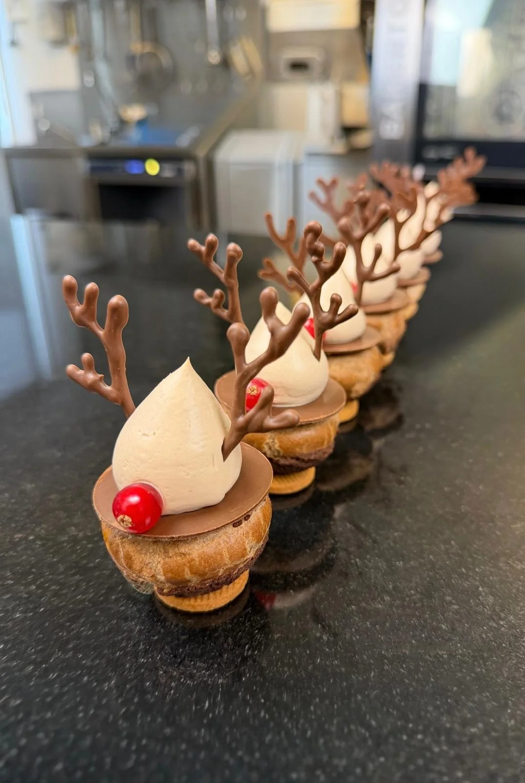 La Maison de Noël est un dessert festif qui rappelle de doux souvenirs. Fait de croustillant, d’un biscuit moelleux chocolat, d’une ganache montée vanille, d’un confit de fruits rouges et citron vert, d’une chantilly chocolat, d’un biscuit cuillère et d’une pâte sucrée aux amandes.